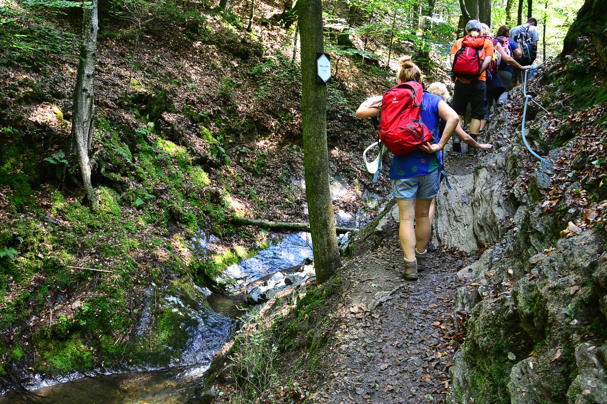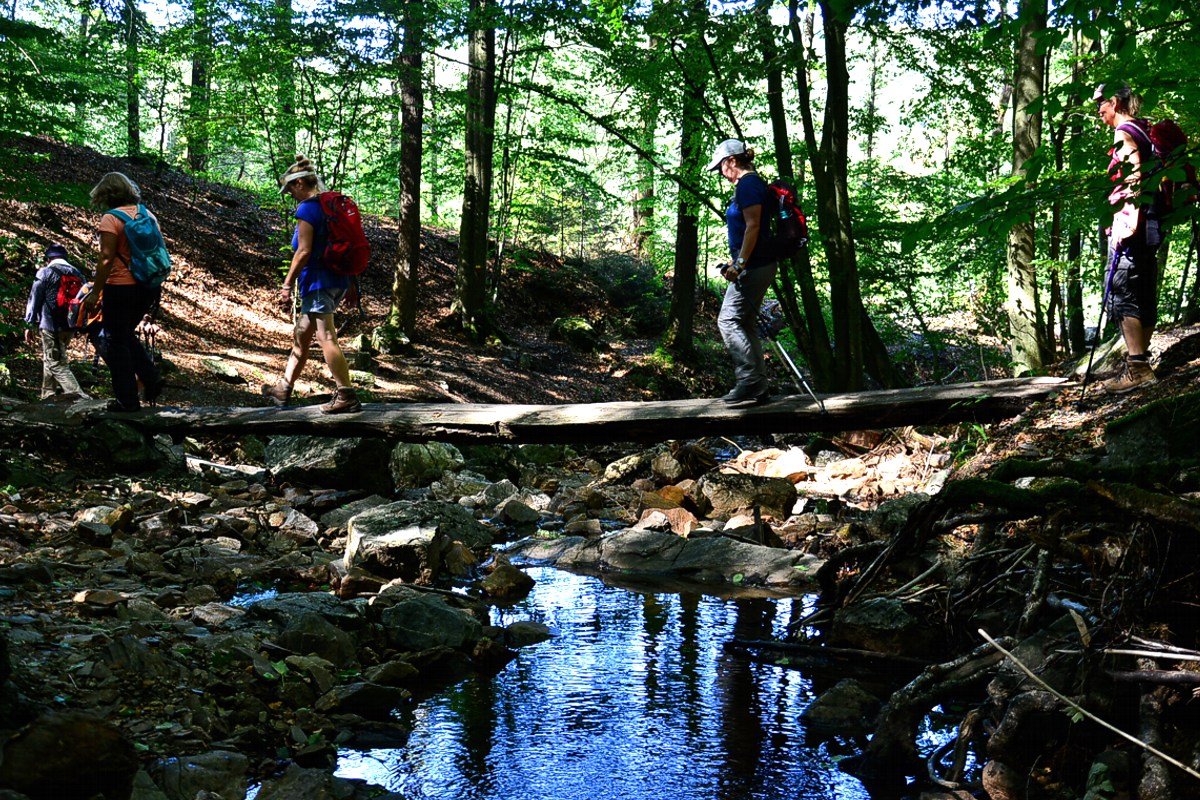 Tag 4: OK, Entspannung sieht anders aus! Bei der Fahrt zum Startpunkt werden alle Teil eines Radrennens und dürfen sogar viele Kilometer im Feld mitfahren. Doch damit nicht genug! Am Startpunkt der Wanderung angekommen haben sich (gefühlt) alle Einwohner Belgiens und der Niederlande versammelt, um mit uns den Ninglinspo hinauf zu wandern. Irgendwie „verläuft“ sich aber die Masse und spätestens bei der Querung zur Chefna sind wir wieder allein unterwegs. Bei der verdienten Mittagspause dösen alle in der Sonne. Alle? Nein! Denn eine ungeduldige Wanderiene gemahnt mit den Worten „Ich bin doch hier zum Wandern“ zum Aufbruch. Zuerst widerwillig doch dann wieder mit offenen Augen genießt die Truppe den Weg entlang der Chefna. Bevor diese mündet habe ich mir noch etwas Spezielles ausgedacht. Während die „Genießer“ weiter einem Forstweg folgen sind die „Abenteurer“ mit mir auf einem spannenderen Pfad unterwegs. Auf Holzbohlen (naja, manchmal werden auch Männer zur Pussy und gehen lieber durch das Bachbett) immer wieder die Bachseite wechselnd gelingt schließlich die Wiedervereinigung mit den „Genießern“ und gemeinsam wandern alle ins Tal der Amblève. Dieser Fluss ist so idyllisch, dass ich kurzerhand eine Pause genehmige. Einige Wanderer verteilen sich auf Felsbrocken im Fluss, genießen die Sonne und beobachten eine Teilnehmerin, die beim Durchwaten der Fluten die Schuhe anlässt und diese (unfreiwillig) wässert. Zum Glück hat sie noch trockene Schuhe im Rucksack (!?!) und so gelangen alle nach „der schönsten Tour des Urlaubs“ unbeschadet zurück zum Ausgangspunkt. Nach einem gemeinsamen Abendessen heißt es „schnell zurück nach La Roche“, wo das Gespenst auf der illuminierten Burg seinen allabendlichen Auftritt absolviert. Na dann, Gute Nacht!