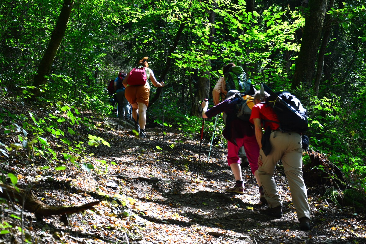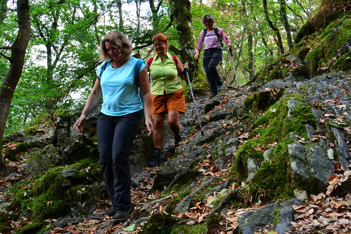 Tag 5: Wieder scheint die Sonne und die Wanderschar macht sich auf zur letzten Tour des Urlaubs. Gleich nach dem Start wählen einige Teilnehmer den anspruchsvollen Felsenpfad (siehe auch „Aus dem Tagebuch des Wanderführers – Unvergessliche Tage in Belgien – Tag 4“) während der Rest über den „Normalweg“ zur Ourthe hinab steigt. Als alle wieder vereint sind beginnt die traumhaft schöne Wanderetappe am Ufer des sanft dahin strömenden Flusses. „Noch eineinhalb Stunden“ denke ich, „dann habt ihr ausgeträumt“ und tatsächlich quält sich die Gruppe später einen steilen Hang zur ehemaligen Keltenfestung hinauf. Dort angekommen sorgen die wunderschöne Aussicht und vor allem die großzügig gewährte Mittagspause für zufriedene Gesichter. Wieder dösen einige in der Sonne und lassen es sich ohne zu Gehen gut gehen. Trotzdem bereitet es mir keine Schwierigkeiten, „meine“ Wanderienen und Wanderatten zur nächsten Etappe zu animieren. Unglücklicherweise ist der Weg durch einen Windbruch immer noch nicht (sicher) begehbar und so folgt nach dem Abstieg zur Ourthe gleich wieder ein steiler Anstieg durch ein Bachtal. Oben angekommen werden letzte Kräfte mobilisiert und in leichtem Trab geht es in ständig wechselnden Auf und Ab zurück zum Startpunkt der letzten Wanderung. Noch ein gemeinsamer Kaffee und dann nichts wie ab nach Hause. Denkste! Die (erst) 210.000 Kilometer alte Batterie einer Teilnehmerin versagt den Dienst und kann nur mit Hilfe technischer Expertise und Ausrüstung wieder reanimiert werden. Dann aber entschwinden alle Richtung Heimat und träumen hoffentlich noch lange von unseren Wandertagen in den belgischen Ardennen.