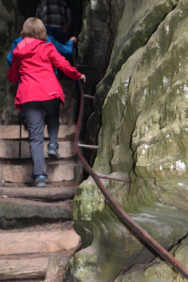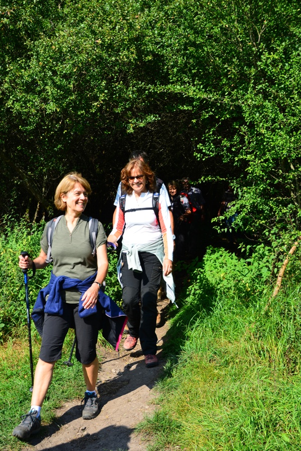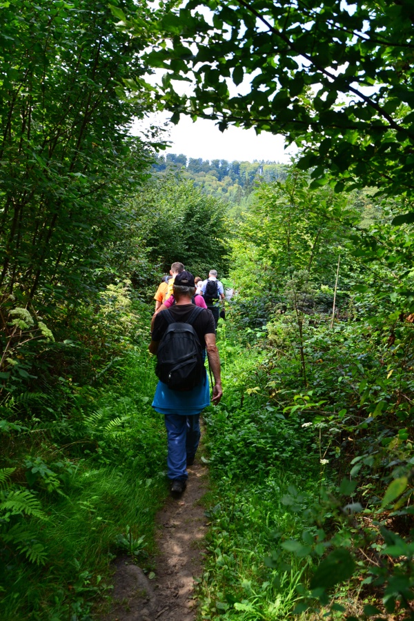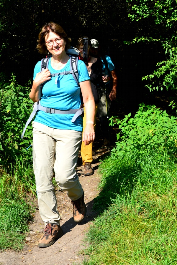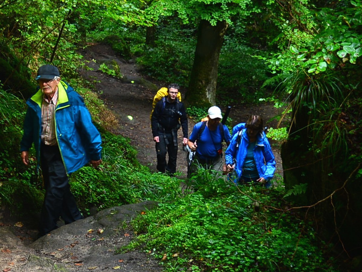 Freitag: Am späten Vormittag starteten die frisch angereisten Teilnehmer, um bei der „Eingehtour“ die Luxemburger Schweiz zu erkunden. WaFü Martin begleitete die Gruppe über viele Steinstufen und über schmale Pfade durch eine großartige Felsenlandschaft. Schon nach kurzer Zeit stand die erste „Überraschung“ auf dem Programm. Ausgestattet mit Leuchtmitteln aller Art konnten die Wanderer die düstere „Räuberhöhle“ erkunden. Danach ging es flott abwärts in ein wunderschönes Tal. Das Tempo war offenbar so hoch, dass einem der Teilnehmer die Sohlen seiner (10 Jahre alten) Wanderschuhe platzten. Mit Mullbinden notdürftig „repariert“ hielten die Schuhe noch einige Kilometer bevor sich die beiden Grobprofilierten endgültig von ihrem Besitzer verabschiedeten. Vorbei an sprudelnden Bächen wanderte die muntere Truppe zum Schloss Beaufort. Dort war Zeit für eine Besichtigung und die Mittagspause. Kaffee, Muffins und Himbeerlikör fanden bei wärmendem Sonnenschein den Weg in ihre persönlichen Transportbehältnisse. Nach der Pause ging es auf eine Hochebene mit herrlichem Blick auf den angekündigten „leichten Schauer am Nachmittag“. Der entlud sich mit Starkregen, Blitz und Donner und veranlasste die Teilnehmer zum Test ihrer vielfältigen Regenschutzutensilien. Nach kurzer Beratungspause in einer Schutzhütte hieß es dann „Jetzt sind wir sowieso nass – also weiter“. Beim Abstieg nach Grundhoff hörte der Regen endlich auf und ab und zu blinzelte die Sonne durch die Wolken. Die trotz der widrigen Bedingungen gute Laune schlug glatt in Euphorie um und so konnte der letzte Anstieg des Tages im Sauseschritt genommen werden. Beim gemeinsamen Abendessen machten dann Gerüchte die Runde. Am nächsten Tag würden die Teilnehmer von einem „unbekleideten WaFü begleitet“ werden. Das waren natürlich nur „Fake News“ aber trotzdem bekamen wohl einige Wanderienen dieses Bild nicht aus dem Kopf und verbrachten eine unruhige Nacht.