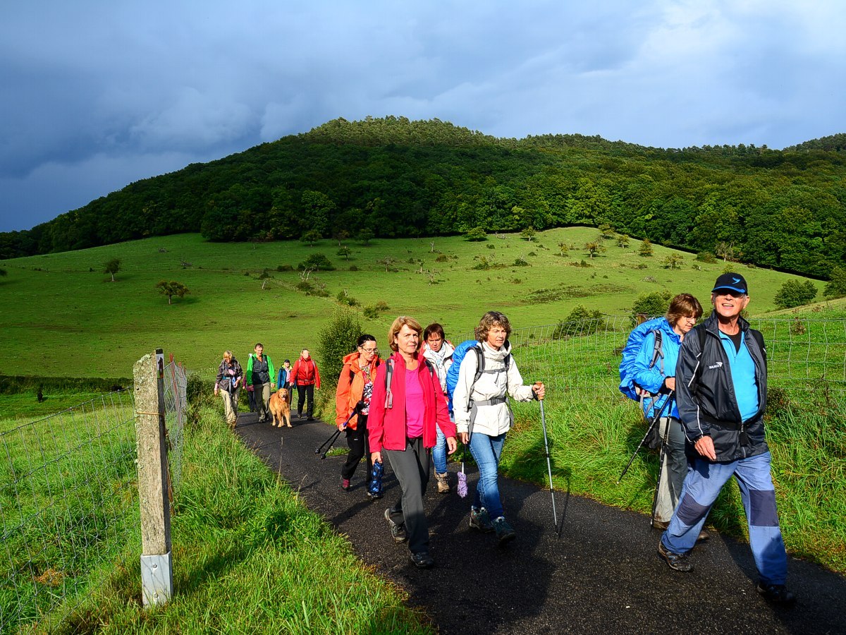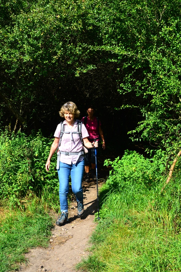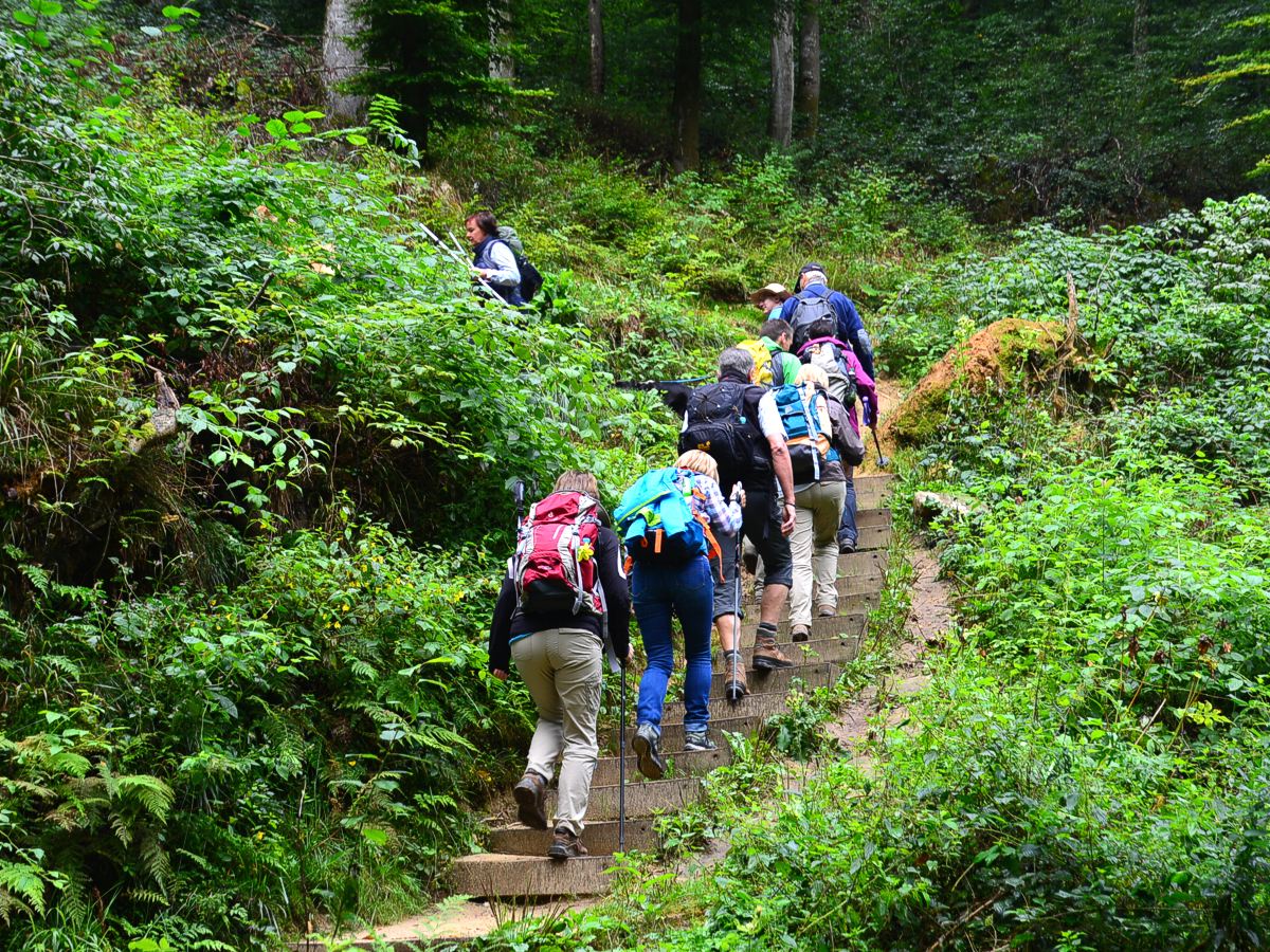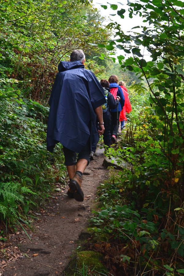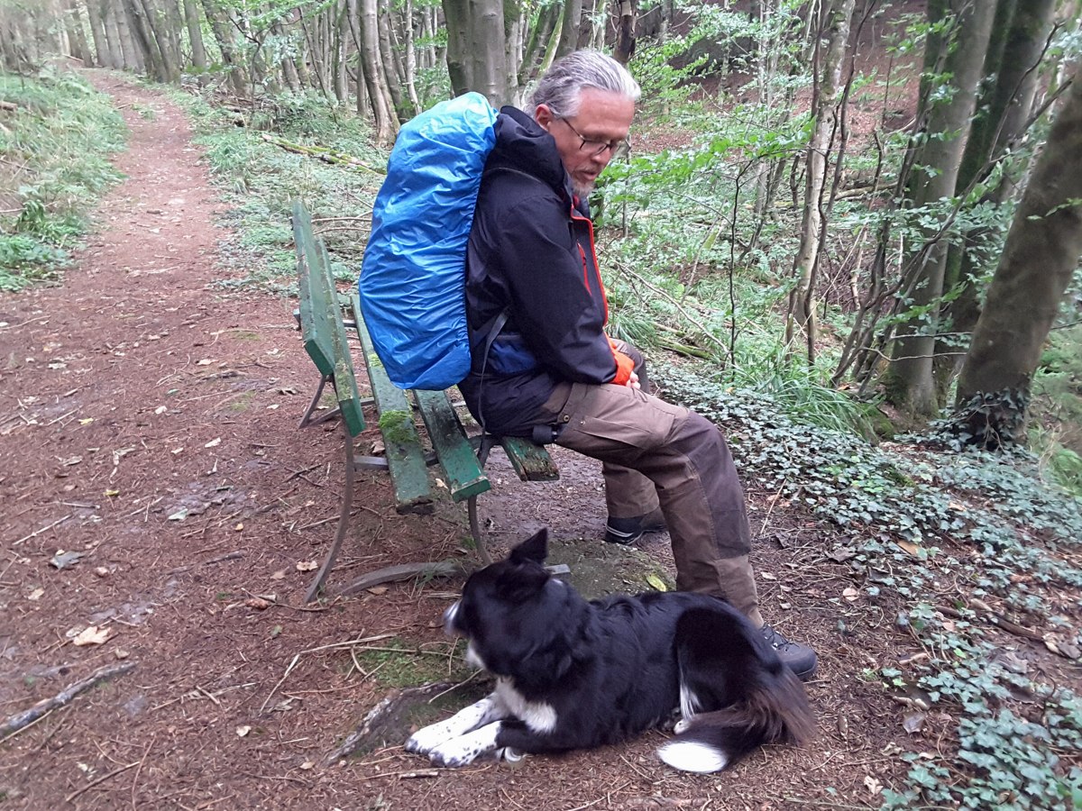 Freitag: Am späten Vormittag starteten die frisch angereisten Teilnehmer, um bei der „Eingehtour“ die Luxemburger Schweiz zu erkunden. WaFü Martin begleitete die Gruppe über viele Steinstufen und über schmale Pfade durch eine großartige Felsenlandschaft. Schon nach kurzer Zeit stand die erste „Überraschung“ auf dem Programm. Ausgestattet mit Leuchtmitteln aller Art konnten die Wanderer die düstere „Räuberhöhle“ erkunden. Danach ging es flott abwärts in ein wunderschönes Tal. Das Tempo war offenbar so hoch, dass einem der Teilnehmer die Sohlen seiner (10 Jahre alten) Wanderschuhe platzten. Mit Mullbinden notdürftig „repariert“ hielten die Schuhe noch einige Kilometer bevor sich die beiden Grobprofilierten endgültig von ihrem Besitzer verabschiedeten. Vorbei an sprudelnden Bächen wanderte die muntere Truppe zum Schloss Beaufort. Dort war Zeit für eine Besichtigung und die Mittagspause. Kaffee, Muffins und Himbeerlikör fanden bei wärmendem Sonnenschein den Weg in ihre persönlichen Transportbehältnisse. Nach der Pause ging es auf eine Hochebene mit herrlichem Blick auf den angekündigten „leichten Schauer am Nachmittag“. Der entlud sich mit Starkregen, Blitz und Donner und veranlasste die Teilnehmer zum Test ihrer vielfältigen Regenschutzutensilien. Nach kurzer Beratungspause in einer Schutzhütte hieß es dann „Jetzt sind wir sowieso nass – also weiter“. Beim Abstieg nach Grundhoff hörte der Regen endlich auf und ab und zu blinzelte die Sonne durch die Wolken. Die trotz der widrigen Bedingungen gute Laune schlug glatt in Euphorie um und so konnte der letzte Anstieg des Tages im Sauseschritt genommen werden. Beim gemeinsamen Abendessen machten dann Gerüchte die Runde. Am nächsten Tag würden die Teilnehmer von einem „unbekleideten WaFü begleitet“ werden. Das waren natürlich nur „Fake News“ aber trotzdem bekamen wohl einige Wanderienen dieses Bild nicht aus dem Kopf und verbrachten eine unruhige Nacht.
