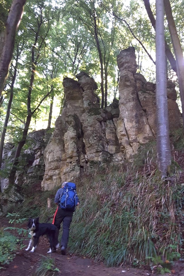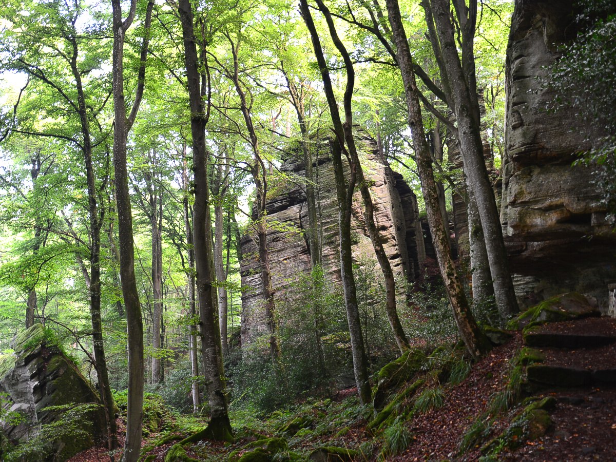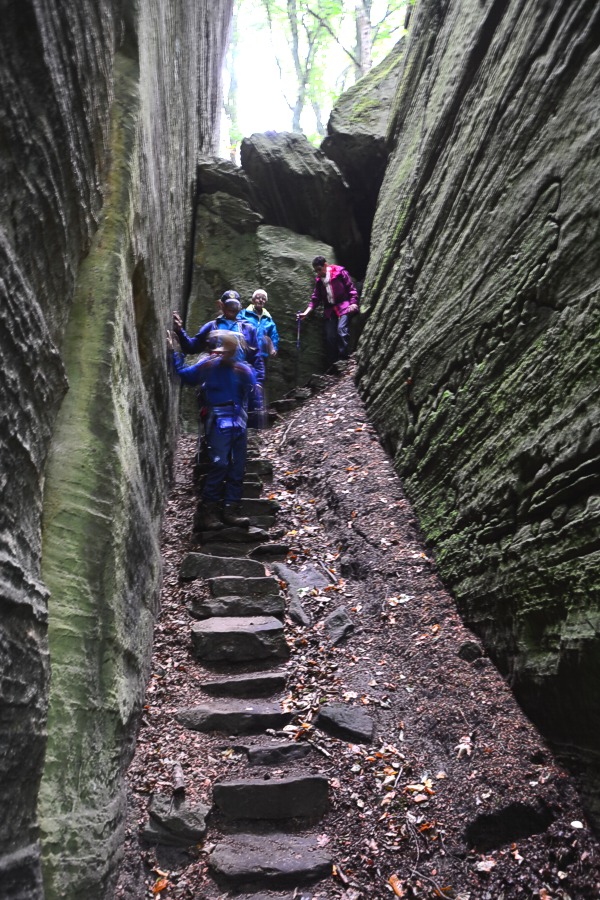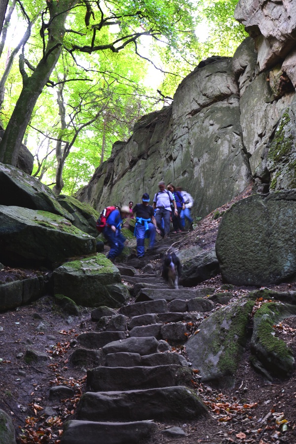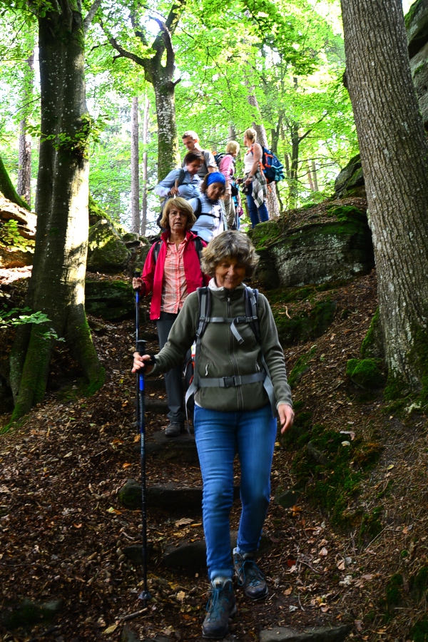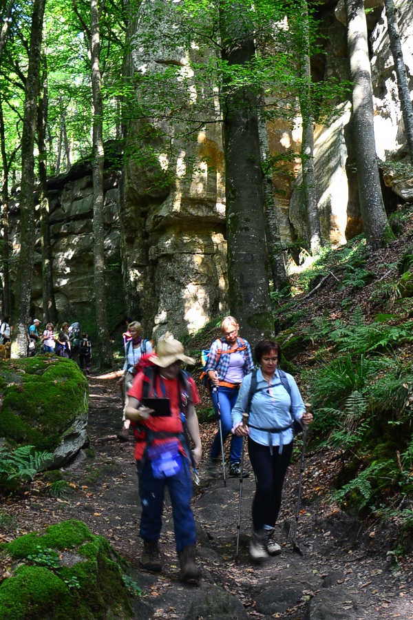 Samstag: Nach dem Frühstück stand die „Große Runde um Berdorf“ auf dem Programm. Der angekündigte Regen schien Besseres vorzuhaben und verschonte die über Nacht angewachsene Truppe. Der (vollständig bekleidete) WaFü hatte einige Überraschungen auf der Strecke eingeplant und führte seine Teilnehmer in ein von Spalten durchzogenes Felsenlabyrinth. Hier war es stellenweise so eng, dass die Passagen nur mit „Quer gehen“, „Luft anhalten“, „Bauch einziehen“ und diversen Tricks bewältigt werden konnten. Nachdem alle wieder aus den Spalten befreit waren ging es in ständigem Auf und Ab durch die großartige Wald- und Felsenlandschaft. Dass es unterwegs nur eine Stunde nieselte reizte den WaFü zur Auseinandersetzung mit „seinem“ Wettergott. „Ist das alles, was du drauf hast“ schallte es durch den Wald und ruck zuck wurde der WaFü vom Rest der Gruppe mundtot gemacht. Um ihn (den WaFü) noch weiter zu demütigen lies der Wettergott dann die Sonne scheinen und veranlasste die Teilnehmer zur wohl verdienten Pause. Danach ging es durch ein zauberhaftes Tal gemächlich aufwärts und natürlich hatte der WaFü wieder eine „Überraschung“ in seinem Rucksack. Wer wollte, konnte den engen Aufstieg im „Perekop“ wagen und von oben einen wunderbaren Blick auf die umliegenden Wälder genießen. Das gegen Ende der Wanderung noch eine Höhle durchquert wurde war das Tüpfelchen auf dem „i“ dieses wunderschönen Wandertages.